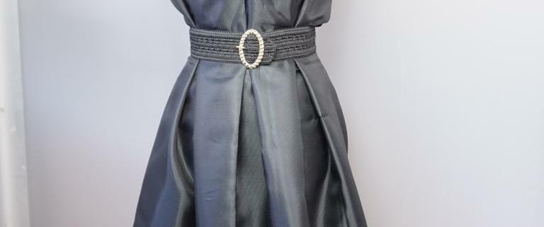Schwarzer Jacquard-Rapport drapiert als Kleid mit Gürtel aus Elastik-Posamentenborte