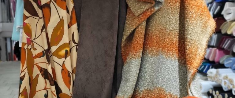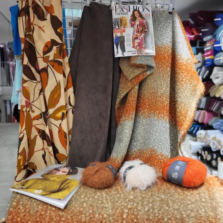 „Irvana“ HerbstblĂ€tter ist eine Viskose von Hilco, es folgt dunkelbrauner Stretch-Feincord. Ein richtiger Hingucker ist der BouclĂš im Farbverlauf.