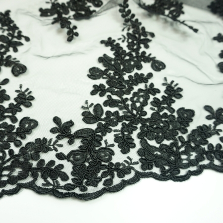 • Spitzenstoff Blumen – Ornamente, Stickerei, schwarz, beidseitige Bogenkante