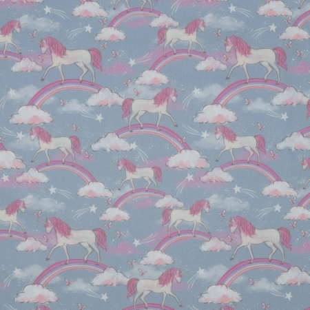 Toller bedruckter Baumwoll Poplin mit Einhörner auf hellblau.