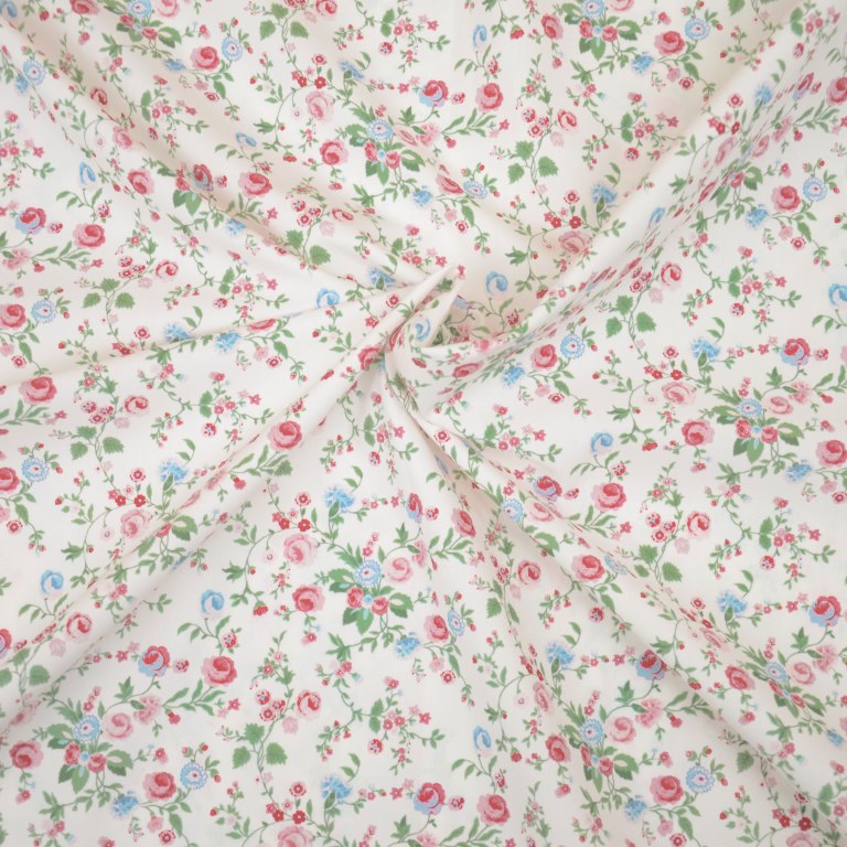 Baumwollstoff „EMILIE“ von Hilco mit Rosenmuster auf wollweißem Untergrund. Perfekt für selbstgenähte Sommerkleidung für Groß und Klein.