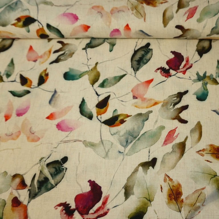 Diese Viskose – Leinen – Mischung mit Blättermuster auf Ecru, ist bestens geeignet zum Nähen von Kleidern, Röcken, Hosen, Tunikas, Tüchern uvm….